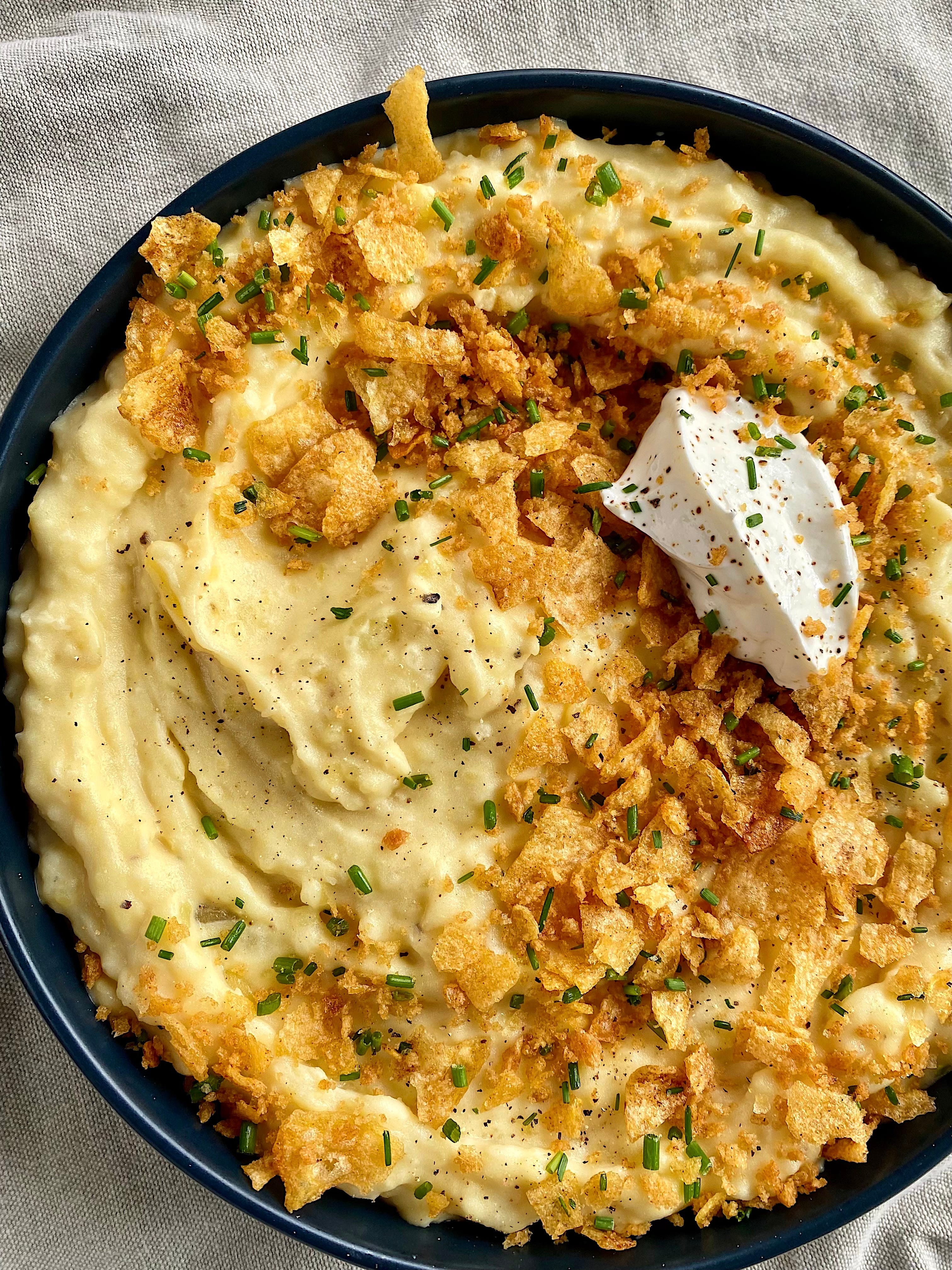 I went home and made mashed potatoes with sour cream and lots of different alliums. Four kinds to be exact. To take the mashed potatoes to the next level, I toasted some actual potato chips and added them to the top. What I ended up with was a flavored hybrid of chips, creamy mashed potatoes, and LIPTON ONION DIP!
